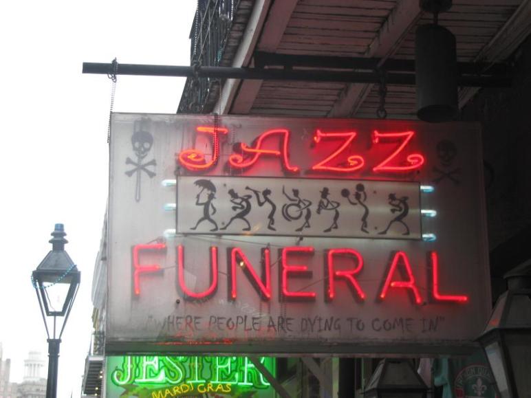 If you can read all the small print, you will see that this sign says “Jazz Funeral, where people are dying to come in”. This place of business, located in the heart of New Orleans, puts a unique spin on the traditional funeral. While you may not have thought much about your own funeral arrangements, some folks plan theirs in advance.