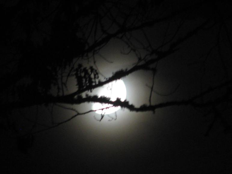Just a week or two ago, the moon was shining brightly through the trees, as you see here. I took several pictures that evening, because each one I snapped seemed to be very fuzzy or out of focus. Finally I got this one lone shot that seemed clearer than the others.