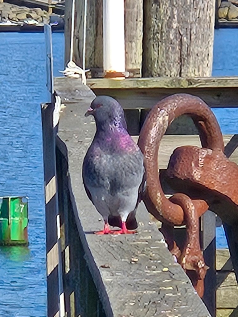 In my random picture taking as I roam, I’m always amazed by any animal activity. One sunny morning as we stood on the pier walkway near the Mayflower reconstruction at Plymouth Harbor, there were not yet many people around, but there were plenty of birds. This particular pretty purple pigeon walked and cooed and walked and cooed up and down the banister. Not afraid of me, it was fairly close. But it didn’t matter to the bird that I was there, that I was so much larger than it, that I was so very close. The pigeon just was itself.