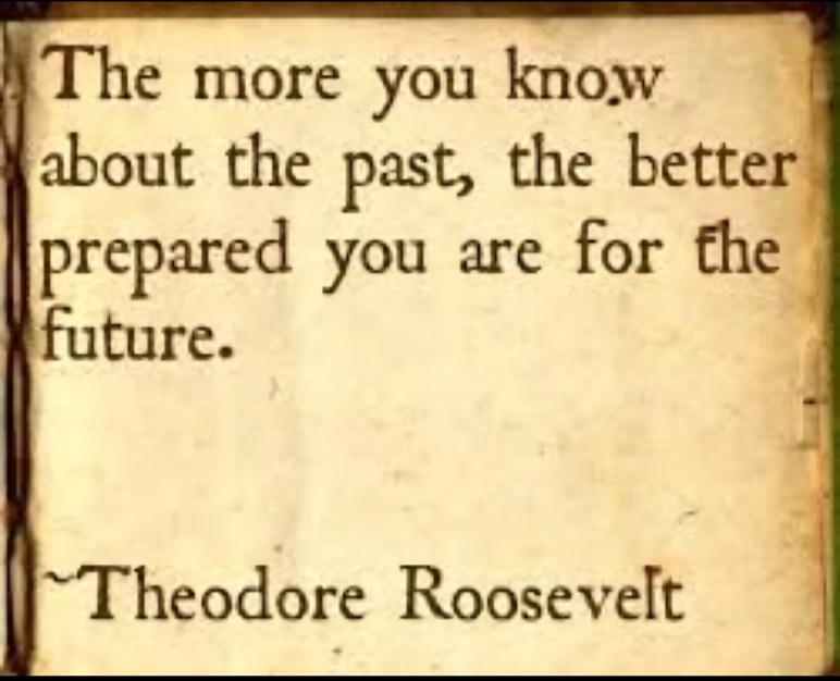 For many people, our family included, the new year begins without several family members who began last year with us.  There are holes that cannot be filled, places that cannot be taken, people that cannot be replaced.  We hesitate to go forward because we are spending an awful lot of time looking in the rearview mirror.  I took a picture of this little sign this past summer in a place I no longer remember.  The quote, attributed to Theodore Roosevelt, says, “The more you know about the past, the better prepared you are for the future.”