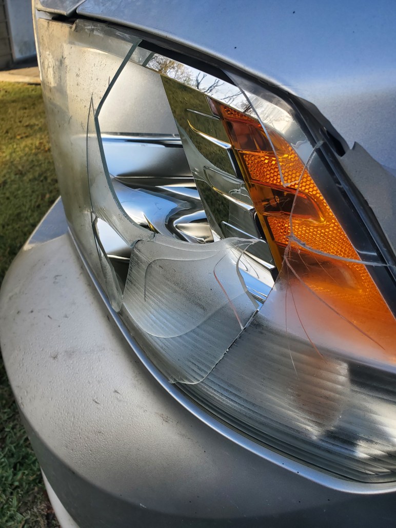 It was as if the creature and I locked gazes for a split second. I could see the whites of its eyes as it stared at me in disbelief. I swerved as much as I dared with the bridge bannisters still so close to us, and the beautiful four-legged animal NEVER MOVED! I submit into evidence the photo of my driver’s-side headlight cover (what’s left of it).