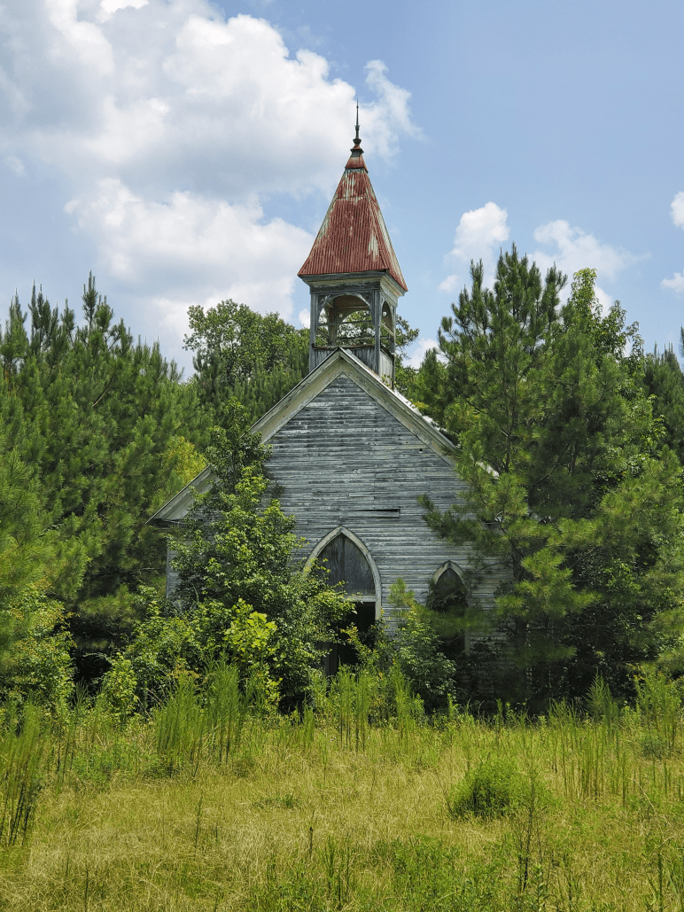 Then, a few years ago, a logging company clear cut all of those trees and that once-forgotten church again appeared in plain view.  Travelers of the nearby state highway began to exclaim over it, having never known it was that close.  Many locals had forgotten it was there, and many others said they’d never seen it before, until that steeple suddenly appeared where treetops had been.  I shared a picture of this church building with you at that time.  I, too, had heard of it but had never seen it until then.