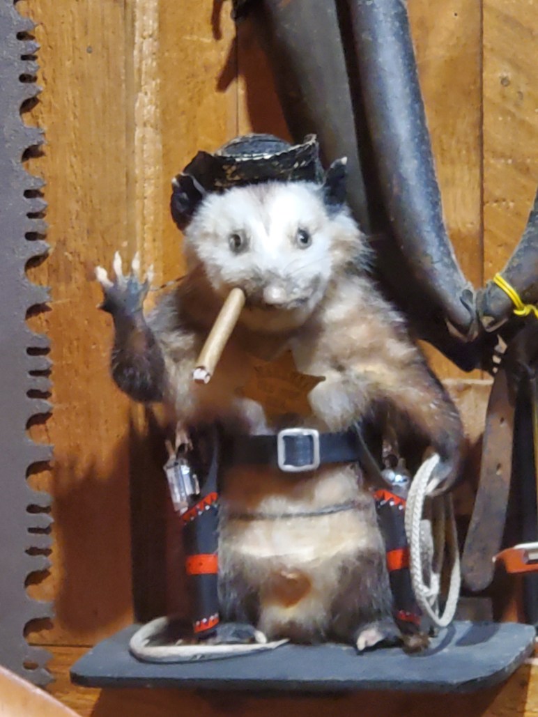 Take a look at this picture.  In the Alabama Music Hall of Fame museum, in a corner display near the end of the self-guided tour, behind glass, stands this little fellow.  It is a taxidermied ‘possum.  This furry little ‘possum is dressed.  He is wearing cowboy paraphernalia.  There is a gun in his holster.  He is holding a lasso rope.  He is wearing a cowboy hat.  And, he is “smoking” a cigar.  Absolutely nothing at all about this thing makes sense!  There is no reason behind it and no explanation given.  It just is.