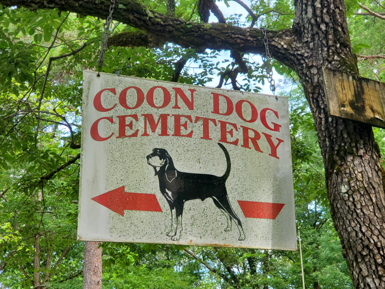 In the northwest corner of the state of Alabama, a passerby on U.S. Highway 72 might see the simple little green highway sign pointing in the direction of the “Coon Dog Cemetery.”  If one ventured off the highway at that point and then traveled a few miles down the road, he would still need to travel even a few more miles off the beaten path to a spot on a hill in the middle of nowhere.  There, just off to the right, nestled in the quiet solitude of the surrounding forest, marked by this particular sign, is the world’s only cemetery dedicated solely to the burials of coon hounds.