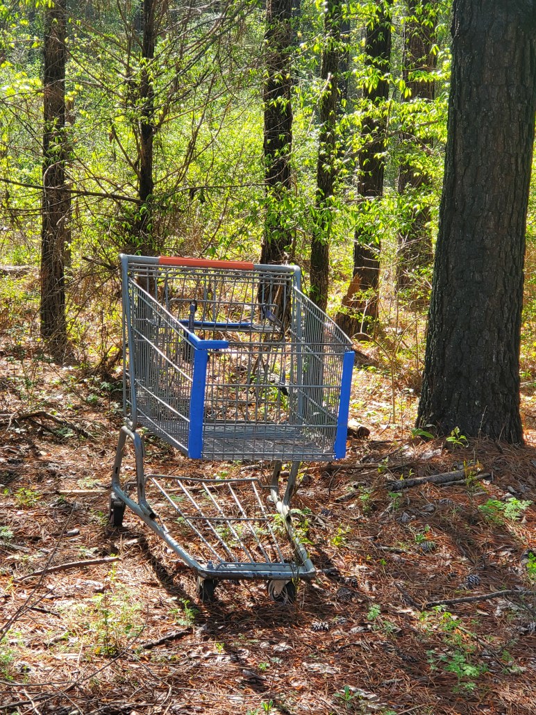 My picture for you this week is in that category as well.  Just down the hill from our church building, on the road where my wife grew up, there in the edge of the woods was this shopping buggy.  The nearest store with any similar cart is a good twenty miles away.  No stores at all within at least six miles.  Not anyone’s back yard.  Just in the edge of the woods.  Who dropped it off there?  And why there?  It makes no sense!