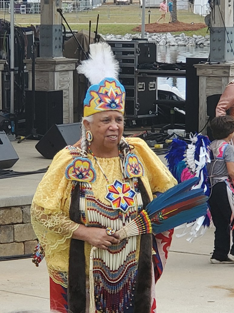 My wife and I very recently spent a few days on the Alabama Gulf Coast with all three daughters and one of their hubbies, and we had a grand time exploring, taking in some sights, relaxing on the beach, eating some good meals, and enjoying the available activities and shows.  One of those shows was a very nice dancing demonstration by the Pow Wow Club of the Poarch Band of Creek Indians, one of whom you see here.  The extravagancy of their costumes seems to ‘hide’ all the cruelty of life that they may have experienced.