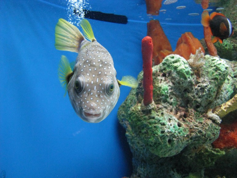I enjoy sitting and watching the fish and other creatures that live in those big aquarium tanks.  Sometimes, like in this picture, a fish will even pause to watch me.  I wonder what he sees in me.