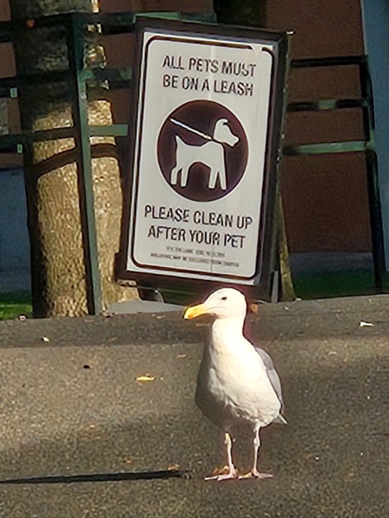 One of those birds, the one you see here, stood defiantly in front of a nearby sign.  The sign, of course, reads, “All pets must be on a leash,” and, “Please clean up after your pet.”  No leash for this animal.  Going to do as it pleased where it pleased.  Ignoring the signs, it roamed on its own with no one to clean up after it.  Certainly a seagull is not anyone’s pet, but this one apparently knew that fact and marched the sidewalk as if to say, “I will not be stopped, I will do life on my own terms, it’s my way or the highway, no one can tell me what to do.”  The people of the world seem to roam around us Christians boasting their ability to get away with whatever they want, while we, God’s people, are trying our best to allow the Lord to lead and control our lives.