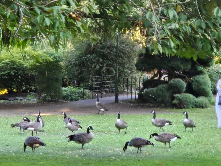 At one time or another, I’ve probably shown you a picture of a Canada goose.  We mistakenly call them Canadian geese most of the time.  Here is a picture I took of several of those birds – thirteen to be exact.  There were many more, but that’s all I could get a picture of at one time.  We were sight-seeing.  The geese were just minding their own business, doing things that geese normally do.  They ignored the people walking nearby.