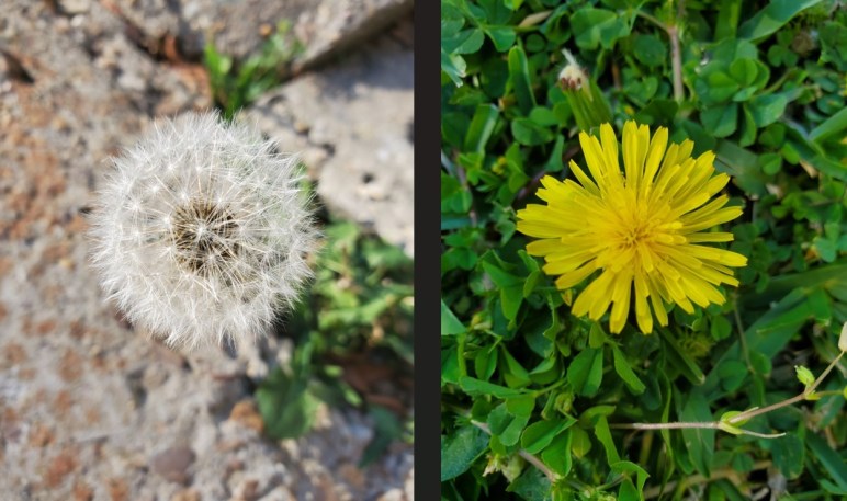 What I want you to notice most of all is that both pictures are dandelions. The yellow flower comes first, then it transforms into the white/fluffy one. Each of those tiny parts can then be scattered to the wind and settle in another place to bloom at a later time. These two pictures are merely different stages of the exact same plant.