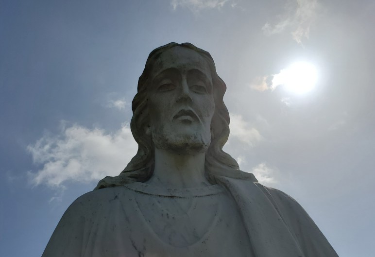 While I pondered all those scrambled thoughts in my mind, I turned around to notice a very tall statue of Jesus behind me.  I had seen it already, of course, as I walked around.  But now it was right there.  I turned, realizing how close I was to it, and looked up to see His face with the sun shining over the Son’s shoulder, and I jerked my phone out of my pocket to get this picture.