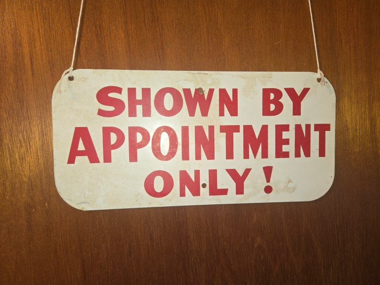A few years ago, I purchased this old sign at an antique store, brought it home, and hung it on my office door.  I did it as a joke, but the sign really serves a purpose.  It’s a kind of deterrent for anyone that might get too close to my piles and stacks of stuff.  “Shown By Appointment Only!”