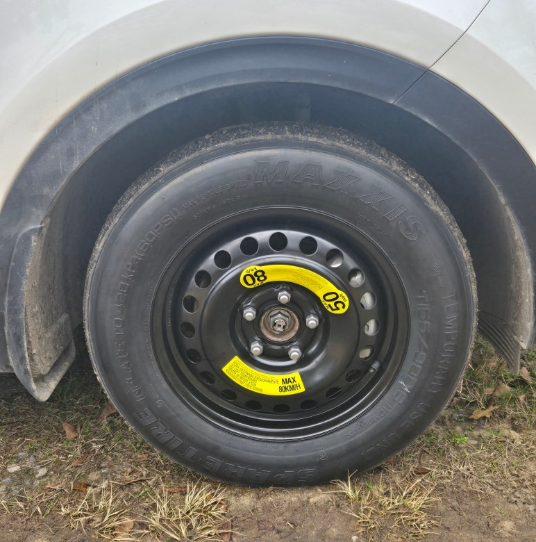 I promised I would.  I set the cruise control to the recommended maximum speed for a donut tire, made the trek back home, swapped vehicles, and again we were on our way.